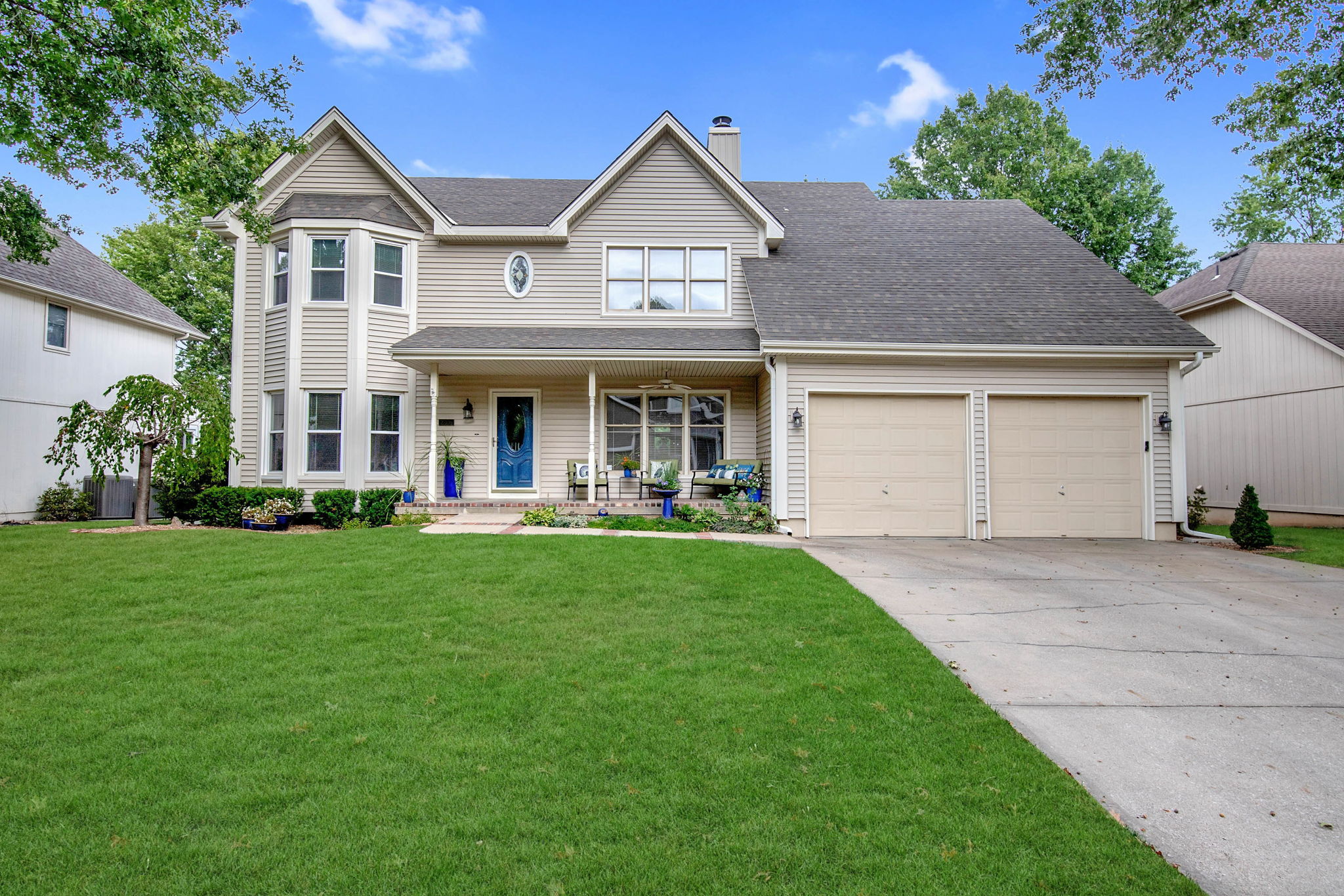 Welcome to this stunning Victorian-style cul-de-sac home located in the desirable Waterfield neighborhood of Blue Springs. You will be welcomed by the cozy, covered front porch. Step inside and be greeted by the warm and inviting ambiance.The heart of the home is the spacious eat-in kitchen, with its vaulted ceilings & convenient counter seating. Also featured is a den with french doors that lead to the living room, providing ample space for relaxation and entertainment. Formal dining, main level laundry and mudroom add convenience to your daily routine. Zoned air conditioning ensures optimal comfort throughout the home. Three fireplaces throughout the home create a cozy atmosphere during colder months, adding a touch of elegance to the overall aesthetic. The massive walkout basement is a true showstopper, flooded with natural light thanks to the abundance of windows. It offers endless finish possibilities, whether you envision it as a recreational space, a home gym, or a media room. Additionally, there is a workshop with a rear-facing garage, perfect for those who enjoy DIY projects or need extra space for their hobbies. Retreat to the huge primary bedroom, complete with a separate sitting area, a walk-in closet, and a luxurious jetted tub, perfect for unwinding after a long day. With two decks, outdoor living and entertaining are a breeze. Situated on a large lot, this property offers plenty of space for outdoor activities and landscaping. The Waterfield neighborhood also offers fantastic amenities, including a neighborhood pool, clubhouse, and a serene lake. Take advantage of these highlights and enjoy a refreshing swim or host gatherings.